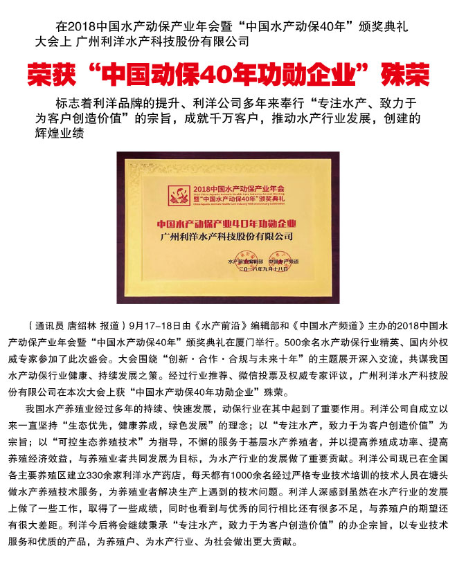 利洋公司榮獲“中國動保40年功勛企業(yè)”殊榮