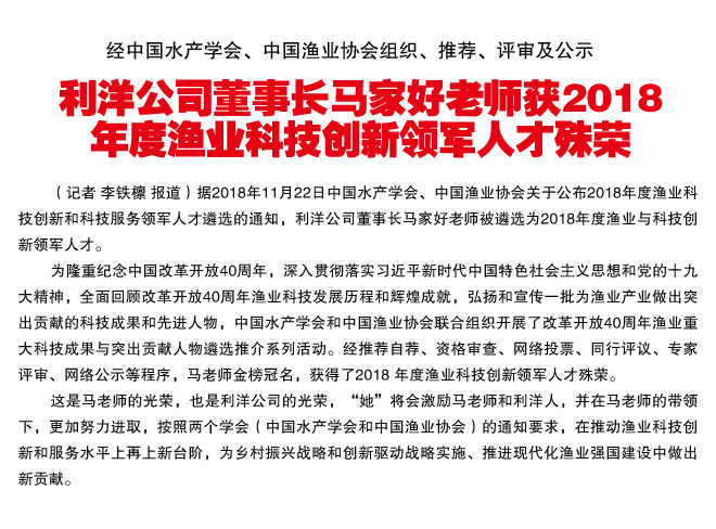 利洋公司董事長馬家好老師獲2018年度漁業(yè)科技創(chuàng)新領(lǐng)軍人才殊榮