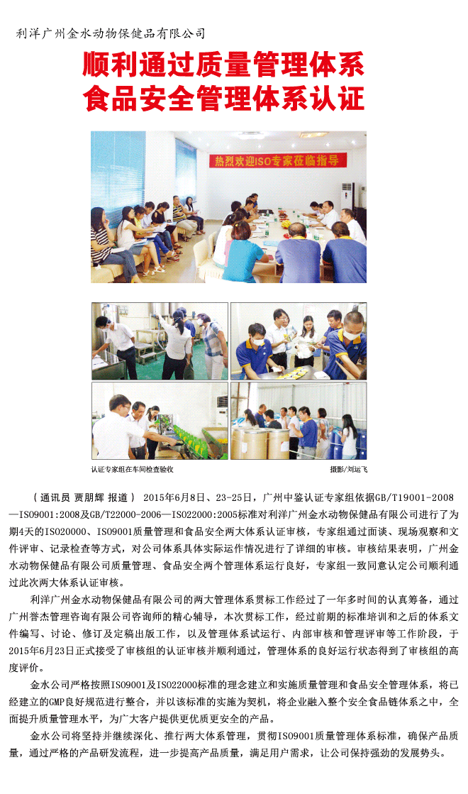 利洋廣州金水動物保健品有限公司順利通過質(zhì)量管理體系食品安全管理體系認證