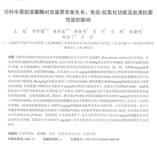 飼料中添加溶菌酶對(duì)吉富羅非魚生長、免疫-抗氧化功能及血清抗菌性能的影響
