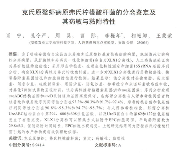 克氏原螯蝦病原弗氏檸檬酸桿菌的分離鑒定及其藥敏與黏附特性