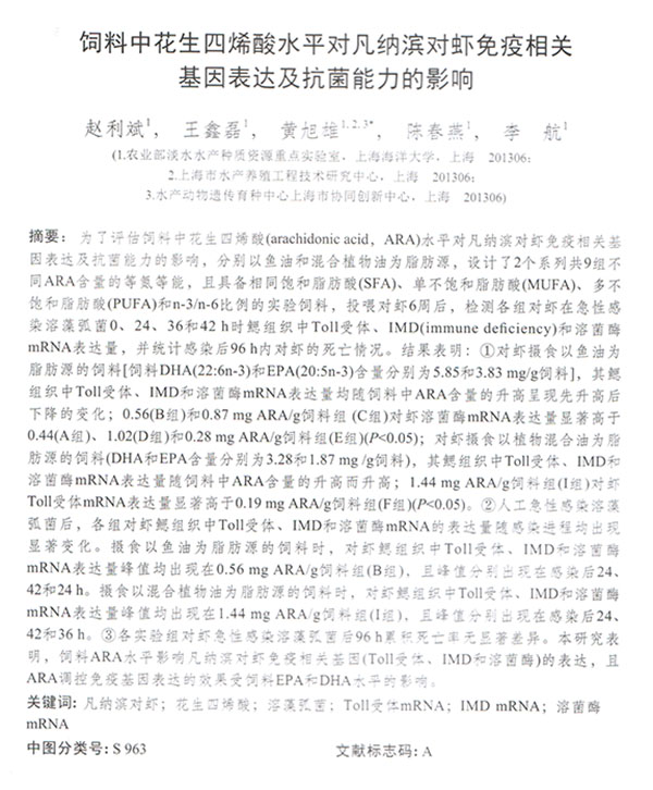飼料中花生四烯酸水平對(duì)凡納濱對(duì)蝦免疫相關(guān)基因表達(dá)及抗菌能力的影響